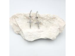 Stylowe kolczyki dwuczęściowe, wykonane ze srebra najwyższej próby 925, rodowane, w kształcie krzyży z cyrkoniami, zapinane na sztyft.